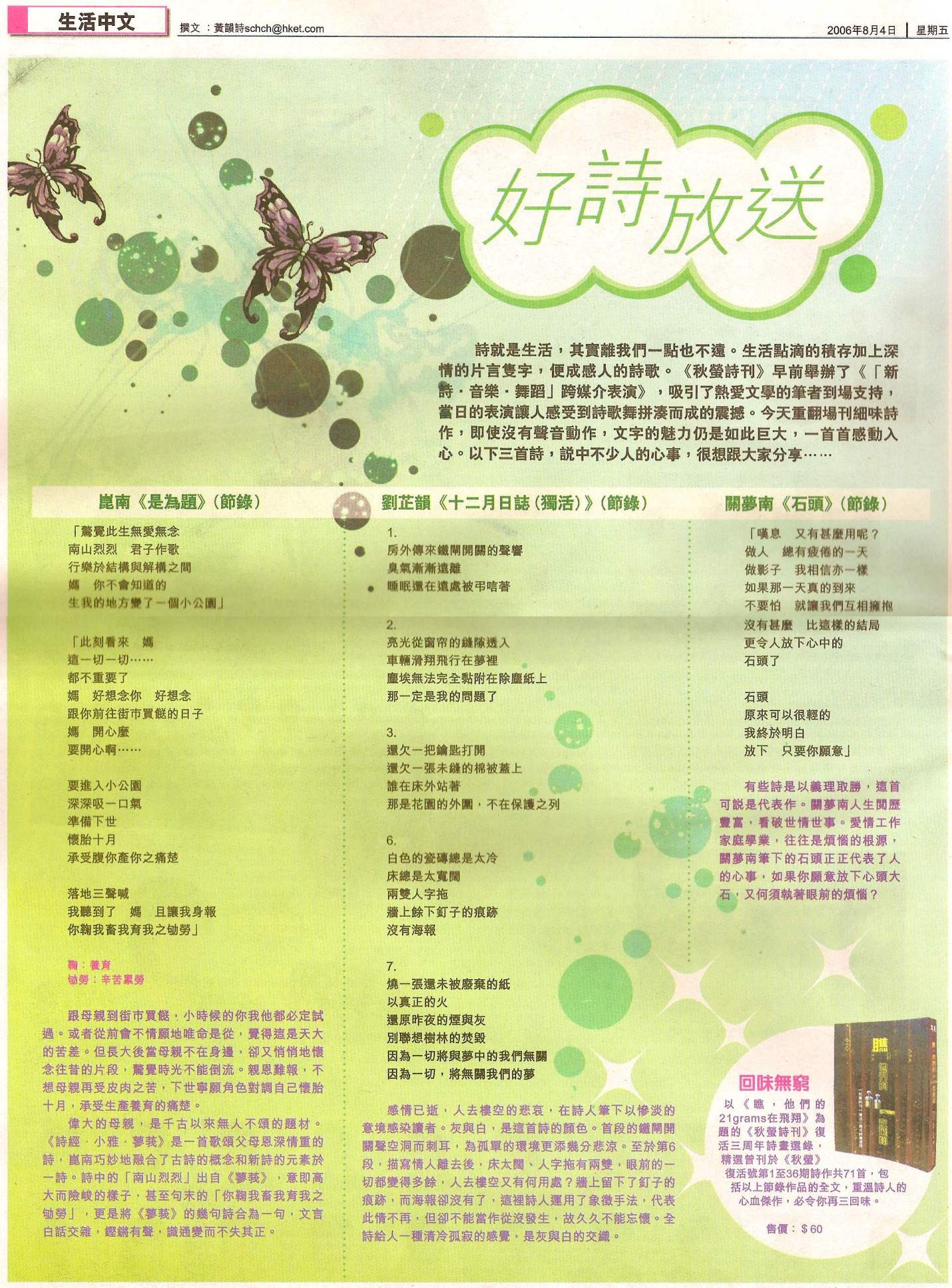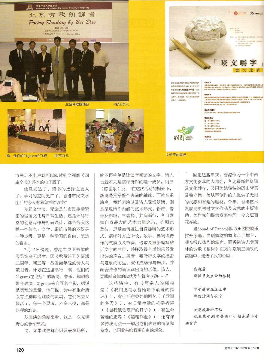 香港電台第二台2006年7月29日「演藝風流」節目,談及香港文學節主持洛楓談及「現代詩跨媒體朗誦會」及「瞧,他們的21 grams在飛翔」按此進入港台節目重溫網頁