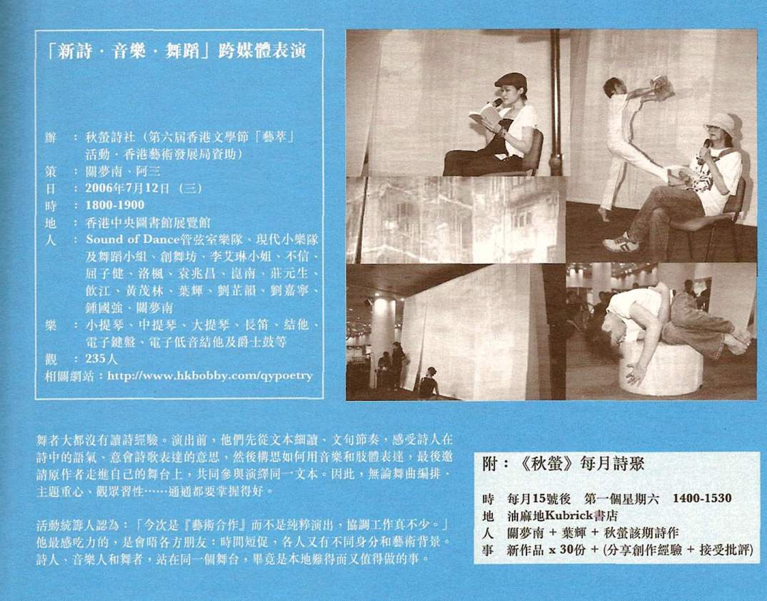 香港電台第二台「思潮作動」訪問,2006年7月3日(一),按此進入港台節目重溫網頁 節目約一小時,談及跨媒介合作的過程及各合作夥伴對詩與演繹詩作的看法